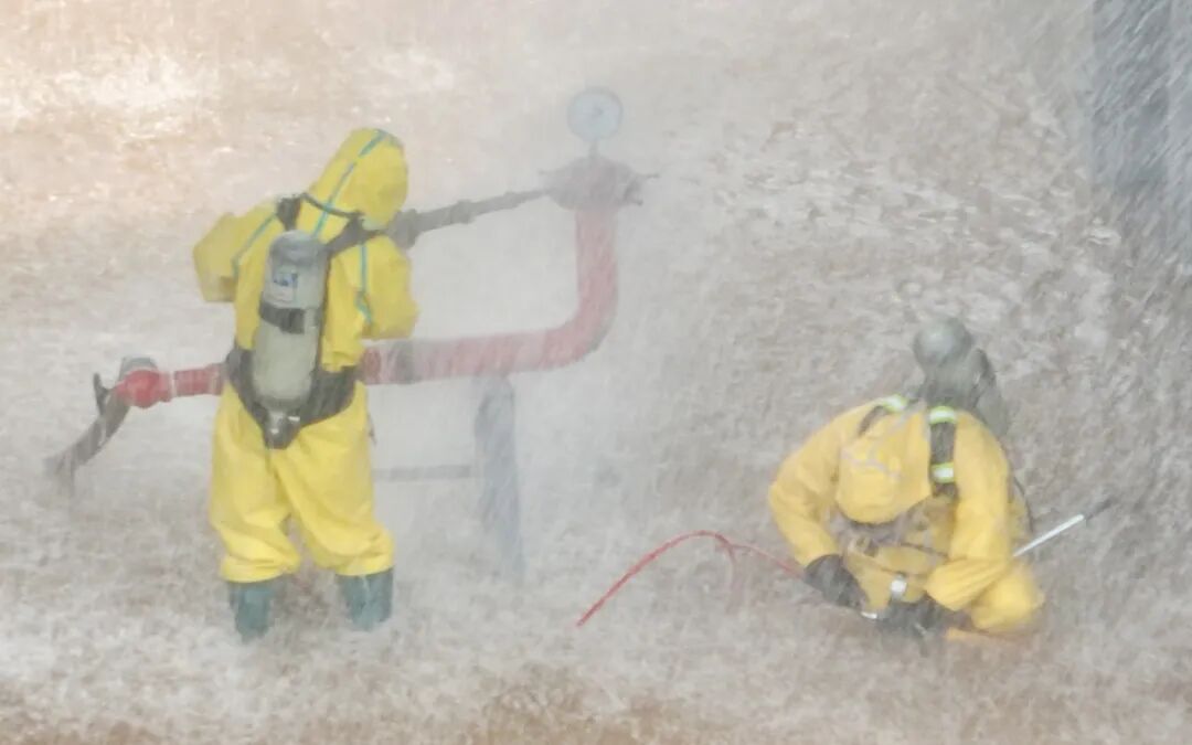本次演练模拟氯碱分厂精单体储槽C槽集水器发生泄漏,各级人员上下联动,迅速开展应急处置,控制险情。确认漏点具体位置后,分厂快速响应,组织应急队对漏点进行封堵,在堵漏处置不成功的情况下,迅速报告公司并请求公司消防队现场支援。接到分厂请求后,公司立即成立应急指挥部,各应急救援工作组迅速到达现场开展抢险处置。